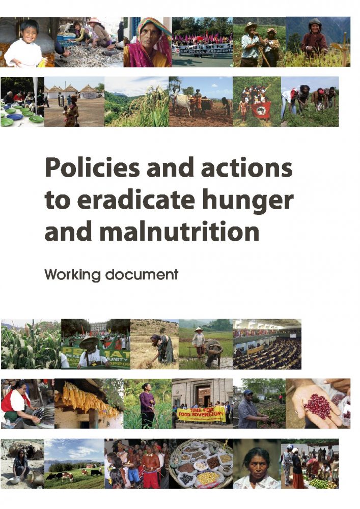 The working document provides proposals for policies and actions to eradicate hunger and malnutrition. It is based on the experiences and political work of social movements, non governmental organisations (NGOs) and others from all over the world during past decades and currently. It is based largely on the food sovereignty framework that embraces the human right to adequate food.